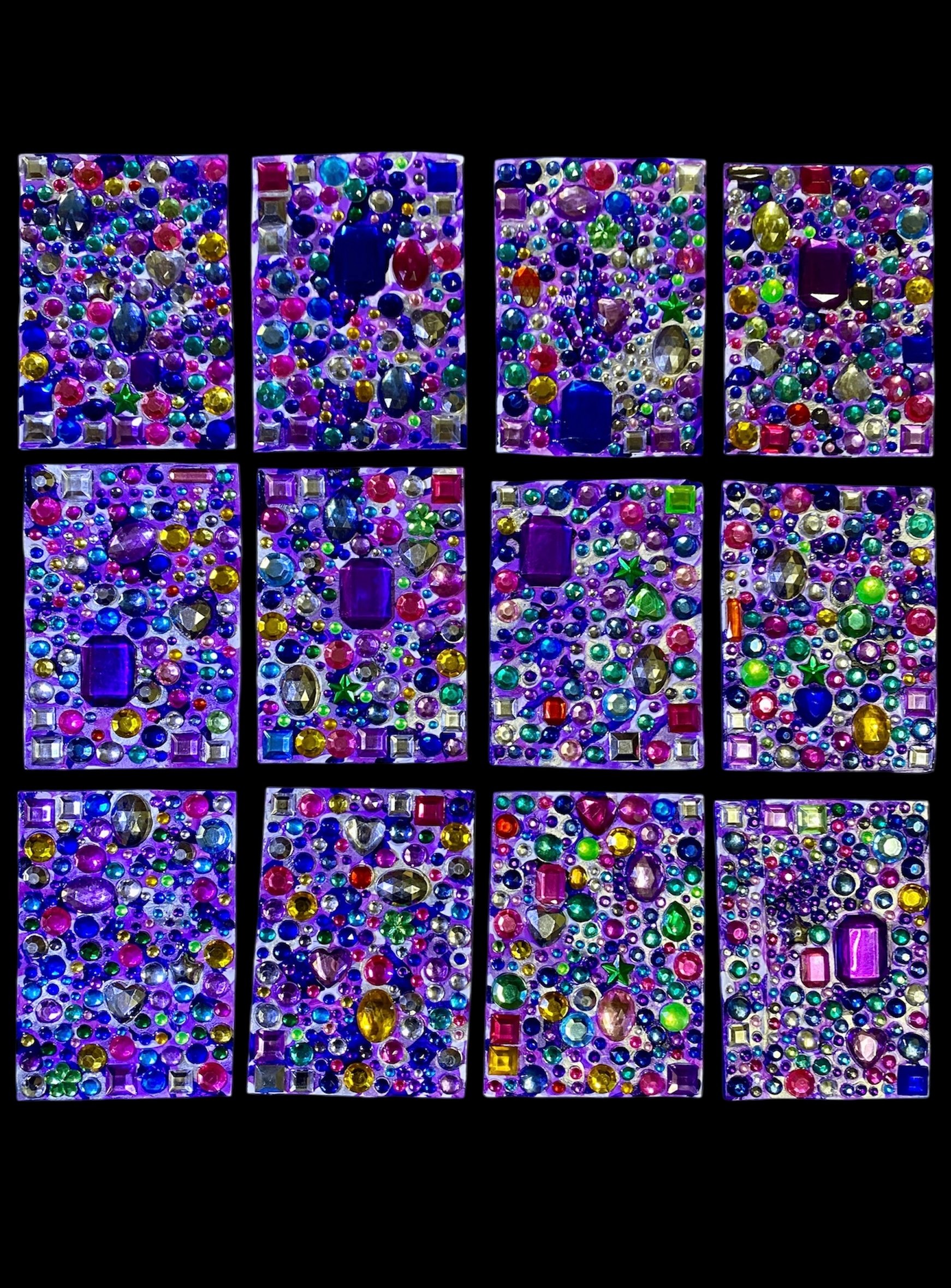 Layers of paper, cardboard, fabric, glues, acrylic paint and rhinestones. Each one is approximately 7.4cm x 10.5cm. You will receive 1 card. Completed in 2026.